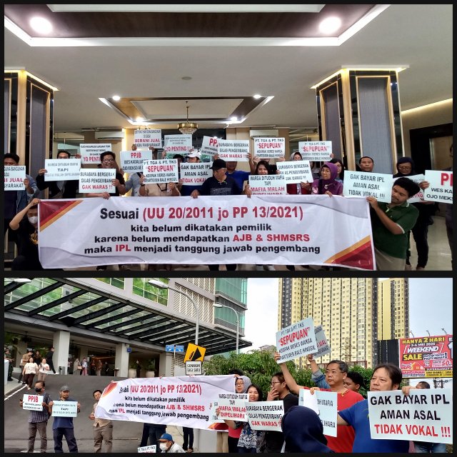 Dalam aksi tersebut, warga membagikan flyer dan membentangkan spanduk bertuliskan tuntutan hukum, salah satunya berbunyi: “Sesuai UU 20/2011 jo PP 13/2021, kita belum dikatakan pemilik karena belum mendapatkan AJB & SHM/SRS, maka IPL menjadi tanggung jawab pengembang.”