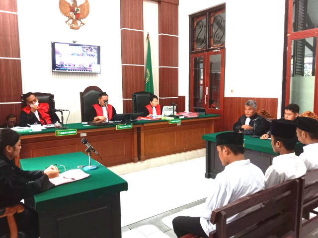 “Menyatakan Terdakwa I Yoyok Harianto Bin Sugi, Terdakwa II Ahmad Afrilian Two Nailil Marom Bin Ahmad Munir Rabith dan Terdakwa III Yuda Anjar Wicaksono Bin Sunyoto tersebut di atas terbukti secara sah dan meyakinkan bersalah melakukan tindak pidana. “Bersama-sama Melakukan Penyalahguna Narkotika Golongan I Bagi Diri Sendiri” sebagaimana Dakwaan Alternatif Kedua Penuntut Umum. Menjatuhkan pidana kepada Para Terdakwa oleh karena itu dengan pidana penjara masing-masing selama1 (satu) tahun dan 4 (empat) bulan,” tutur Majelis Hakim Rudito Surotomo, SH., MH.