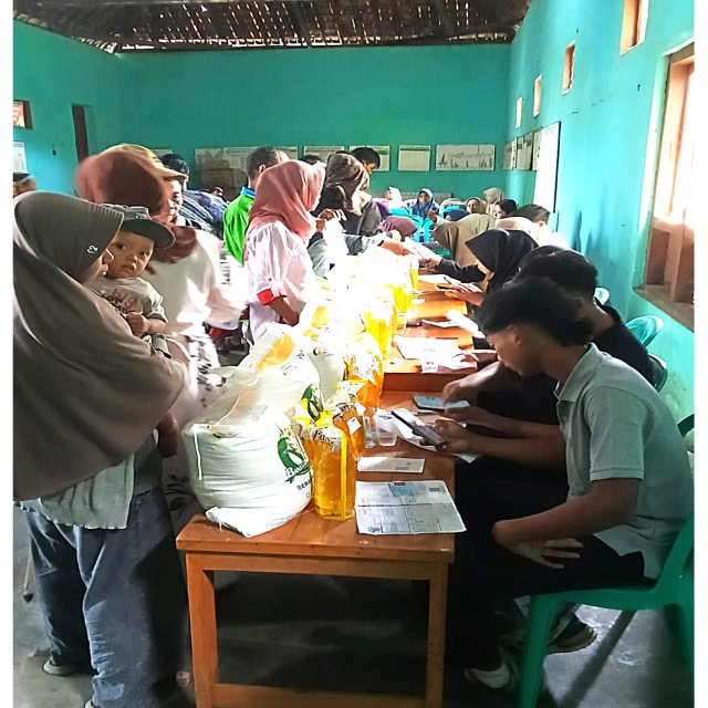 Para KPM tampak antre tertib menunggu pembagian penyaluran bantuan berupa beras premium kemasan 20 kilogram serta empat bungkus minyak goreng yang berisi masing-masing 2 liter di pendopo kantor desa setempat, Jumat (17/4/2026).